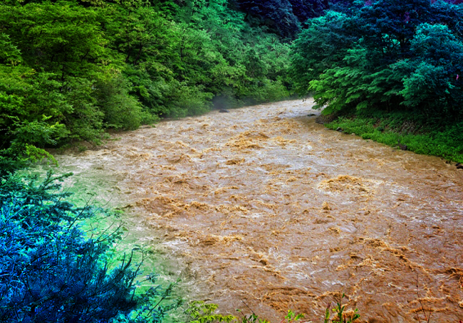 ふだん見慣れた川も表情を変え、溢れんばかりの濁流と化した。
