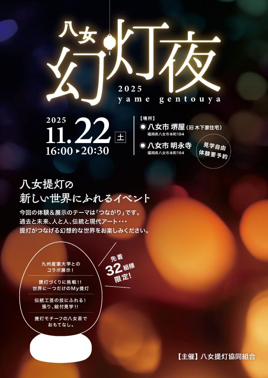 日時: 2025年11月22日(土)16:00〜20:30 会場:明永寺(福岡県八女市本町164)、堺屋(旧木下家住宅/福岡県八女市本町184) URL:https://gentouya-yame01.peatix.com/view