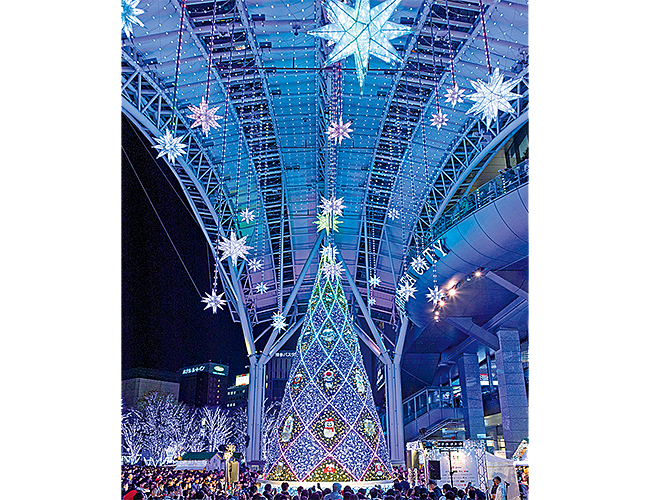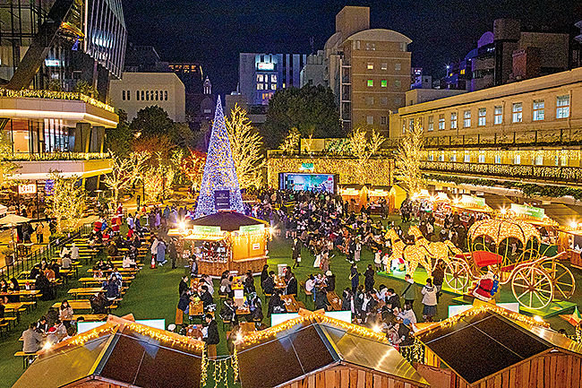 JR博多駅博多口の広場が約64万個の華やかなイルミネーションで彩られます。今年は「スーパーマリオ」のホリデーデザインキャラクターが印象的な高さ14.9mのシンボルツリーをはじめ、マリオの仲間たちと「スーパーキノコ」などのアイテムが楽しげに動く映像が2階のペデストリアンデッキに投影されるなど見どころがいっぱい。同時にクリスマスアドベントなどイベントも開催され、“魅せる、食べる、楽しむ冬の街”を演出します。