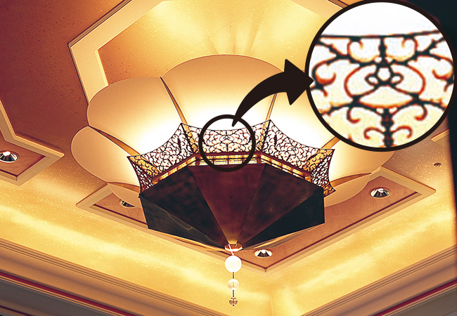 エントランスのシャンデリアのふち部分にあります。ロゴマークは福岡市民にはおなじみのグラフィックデザイナー西島伊三雄さんの作品です。博多祇園山笠の(か)き縄をモチーフに人と人との固い結び付きを表し、末広がりに。ロゴタイプは歌舞伎などで大入り満員を願い、文字を肉太に書く日本の伝統に倣ったものです。