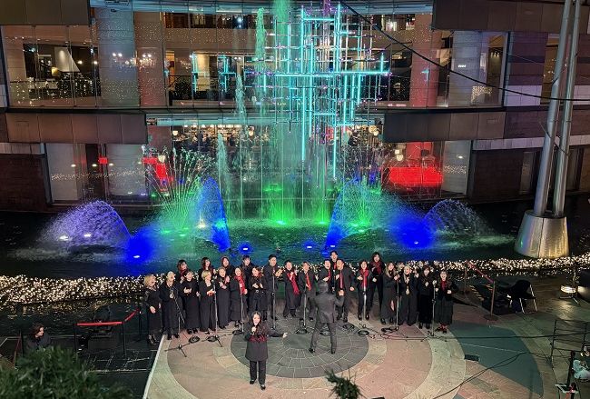 イルミネーションが美しく点灯する中、ゴスペルグループ「THE SOULMATICS」が登場。チームワークばっちりのハーモニーでクリスマスソング2曲をパワフルに楽しく歌い上げました。