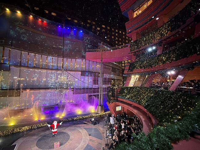 点灯式を締めくくったのは、約2,500インチという巨大スクリーンを使った3Dプロジェクションマッピングと噴水、音楽、光が連動するエンターテインメント、キャナルアクアパノラマ「CANAL CHRISTMAS MIRACLE OF LIGHT」。3D映像による壮大なクリスマスストーリーと館内のイルミネーションが連動する特別なショーで会場を盛り上げました。12月25日(木)まで展開されています。