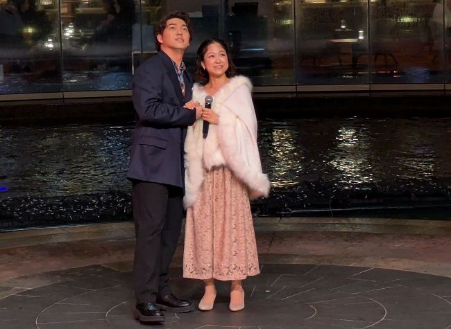 今年のスペシャルゲストは、現在キャナルシティ劇場で上演中の劇団四季ミュージカル「オペラ座の怪人」に出演しているクリスティーヌ・ダーエ役の一人、藤原遥香さんとラウル・シャニュイ子爵役の一人、宇都宮千織さん。劇中ナンバー「オール・アイ・アスク・オブ・ユー」を一緒に歌い上げ、甘く美しい声を響かせました。