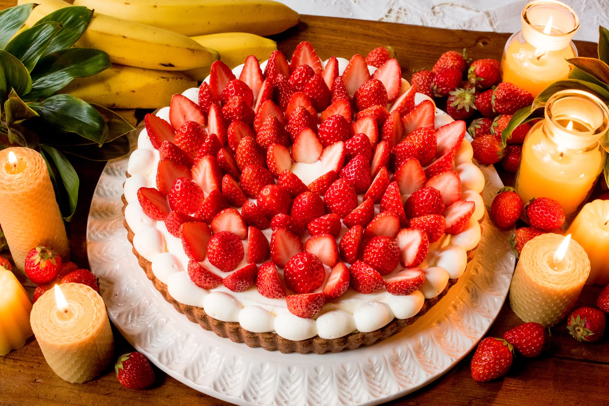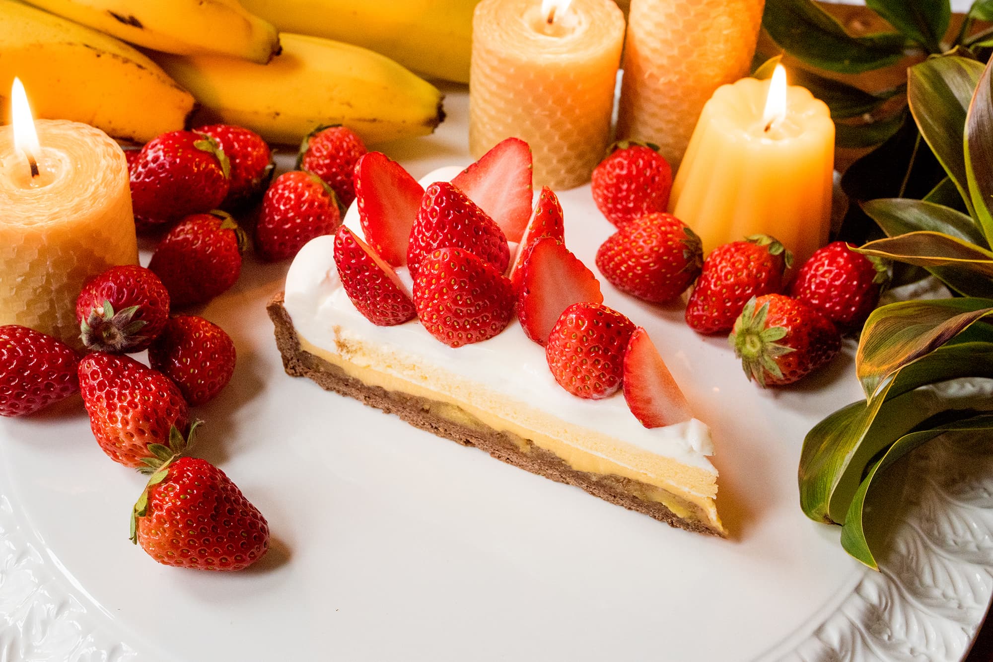 ロウソクの灯火をイメージしたイチゴたっぷりのタルト。中にはバナナのキャラメリゼとホワイトチョコプリンを閉じ込め、甘酸っぱいハーモニーが楽しめます。