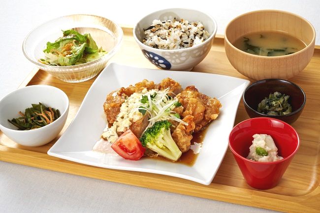 ニンニクしょうゆダレに漬け込み、片栗粉を付けて香ばしくパリッと揚げた鶏もも肉に、甘酢ソースを絡めてたっぷりのタルタルソースをのせた定番メニュー。和風タルタルソースは、隠し味に白みそと刻んだしば漬けを使っているのが味の決め手。定食のご飯は「白ごはん」または「五穀ひじきごはん」から選べます。