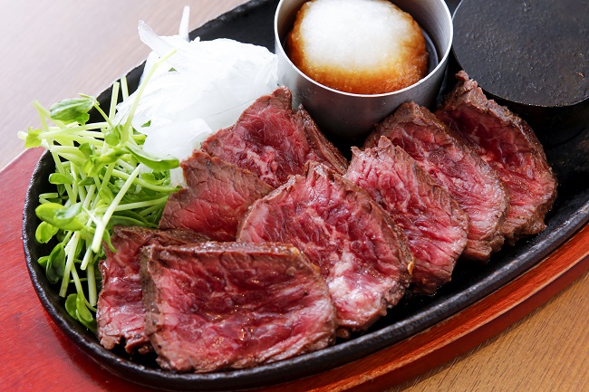 脂質少なめ、軟らかくてヘルシーな牛サガリ肉をオニオンスライスとおろしポン酢でさっぱりいただきます。レアな焼き上がりで提供されるので鉄板で自分好みに焼き上げて。注文時に焼き具合をオーダーしてもOKです。