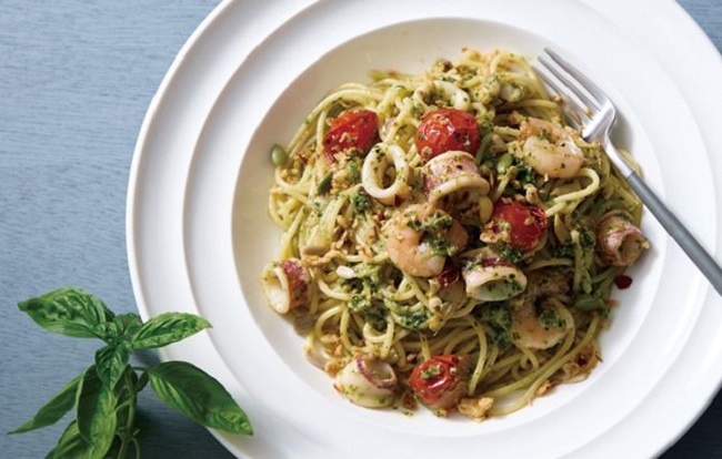 エビ、アサリ、イカなどのシーフードがごろごろ入った人気のパスタ。ガーリックとバジルの香りとほのかに感じる辛さが食欲を刺激します。卓上の「パットフッテ フライドオニオン&ナッツ」をトッピングして香りと食感の変化を楽しんで。店頭でも販売されている、おすすめのトッピング調味料です。
