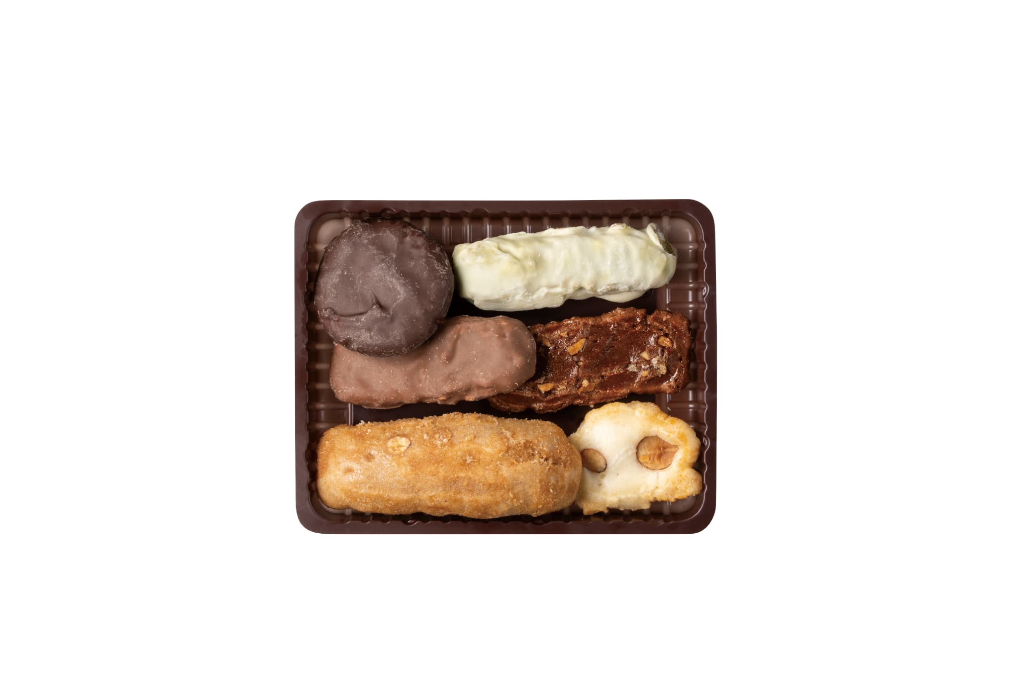 今回の新商品は、手のひらサイズのトレーに、6種類のあられやおせんべいを詰め合わせた特別仕様。甘いチョコレートでコーティングしたおせんべいやあられ、さらに塩気の効いたあられなど、食べ進めるほどに新しい味わいが広がります。もち吉ならではのこだわりの米菓と、ゴディバの上質なチョコレートが織りなす贅沢な組み合わせは、ちょっとしたご褒美やギフトにもぴったりです。