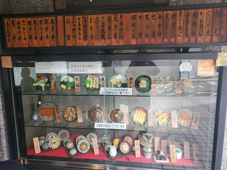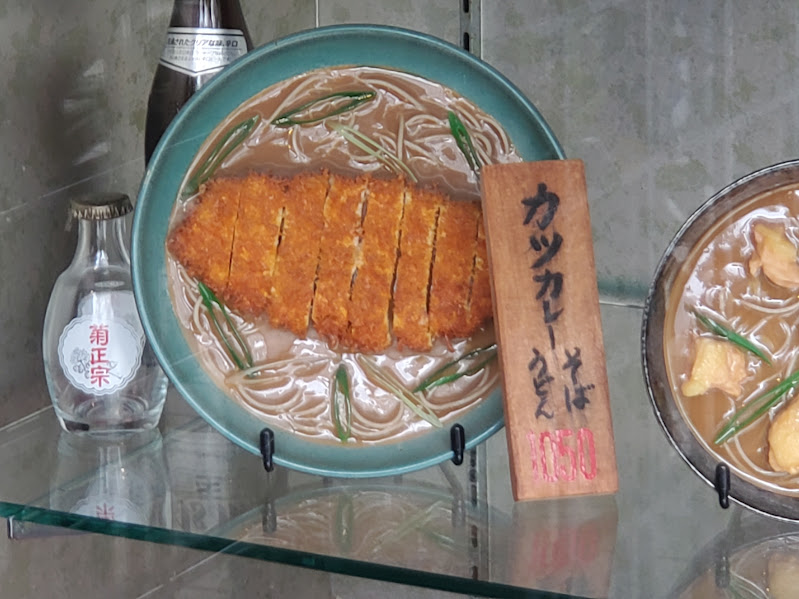 スマホで撮った写真なので、光が反射して見にくいですが、ご容赦下さい。ショーケースは今やなつかしの「食品サンプル」ですよ。昭和40年代子どもの頃はあちこちの食堂やレストランになって、妙に食欲をかき立てられたものです。外食店舗用専門店で有名な東京のかっぱ橋のサンプルのお店をのぞいたことありますが、けっこう値段高いんですよね。