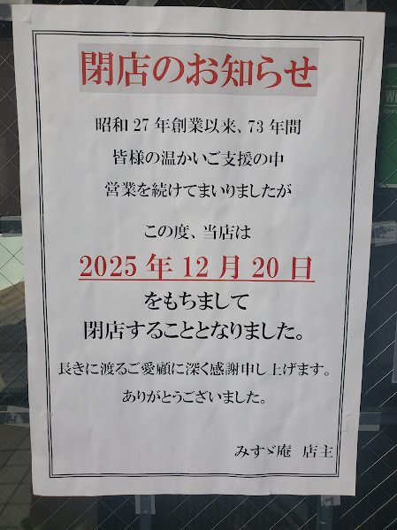 新聞に「みすゞ庵閉店」のことを知り、「急いで行かなくちゃ」と思ってましたが、最近ようやく行きました。正確に書くと、一度入ろうとしたんですが、微妙な行列。次の用事に間に合いそうにないので、泣く泣くあきらめた日もあったんです。