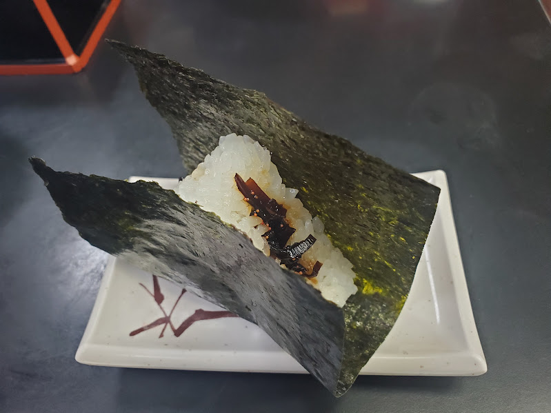 待っている間、久しぶりの店内を見回します。そういえば、パリパリの海苔で巻いて食べるおにぎりも名物だったなあ。もう来れるかわからんから、これも頼もうと追加で注文したら、カツカレーそばが来る前すぐに来ました。昆布を選びました。空腹ですが、メインを口にするまでガマンします。