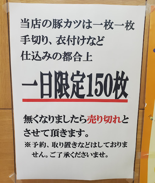 メインもサブのおにぎりも食べ終わる頃、1時20分くらいだったでしょうか。「あと3つ」という声が厨房から聞こえます。少しして店員さんがお客さんに「カツ終わっちゃいましたあ」と告げました。お客さんは心底残念そうな声を出してましたが、気を取り直して再度別のメニューを選んでました。