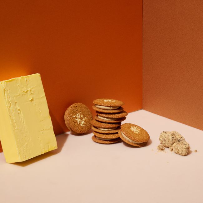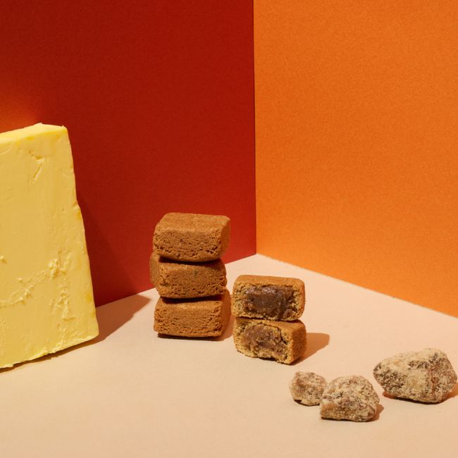 バターと黒糖を練り込んだホロホロのガレットで、黒糖フィリングを包み込んでいます。口の中に広がるバターと黒糖の豊かな風味を楽しめます。黒糖のようなキューブ形のガレットです。
