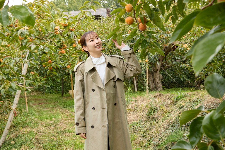 案内してくれたのは、「ゆう美果樹園」4代目・日野勇樹さん。果樹園に入ると、傾斜地に広がる柿の木々が目に飛び込んできます。