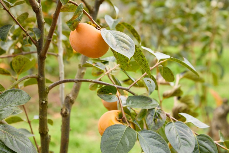 日野さんは、収穫間近のふっくらと実った柿の木を指しながら、