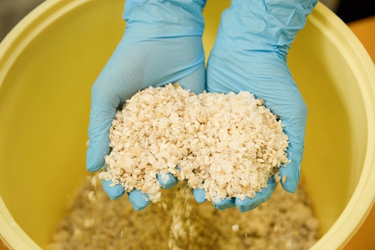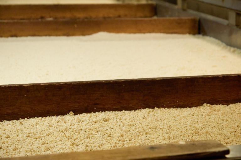 蒸した米に麹菌をまんべんなく散りばめたあと、室の中でゆっくり菌糸が広がり、白い膜が均一にまわっていきます。麹が出来上がるのには3日かかるそう。
