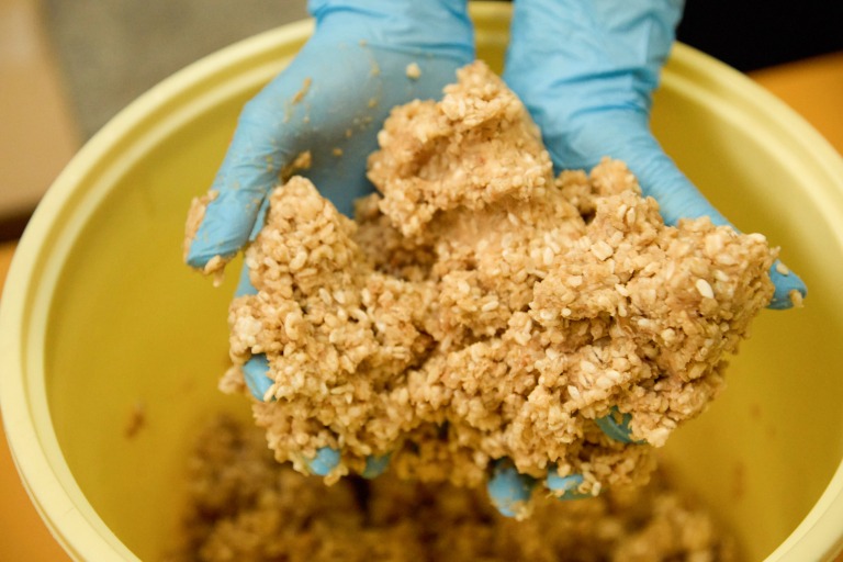 続いて米麹をほぐし、塩を混ぜ合わせる工程では、