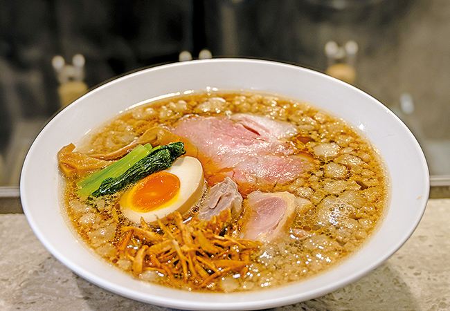 ラーメンは、削りたての本枯節を丼の底にひそませた「醤油そば」と「塩そば」(各850円〜)の2杯が基本。いずれも「さつま知覧どり」の鶏ガラやモミジ(鶏の足)などを約90℃で5時間、じっくりとうまみを抽出したスープが主体です。