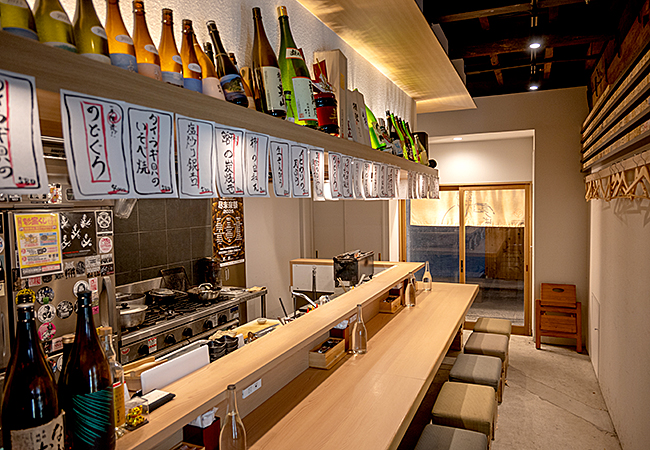 店内は白壁と木目を基調をとした潔さを感じる造りで、カウンターに立つ店主の小島将吾さんと会話を交えながら、気ままな晩酌を楽しめます。
