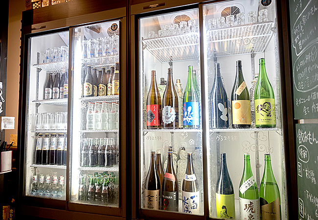 冷蔵庫には、日本酒好きを公言する小島さんが選んだ銘柄が12種類。提供はセルフ方式なので、好みの1本を選んだら自分でグラスに注ぎます。