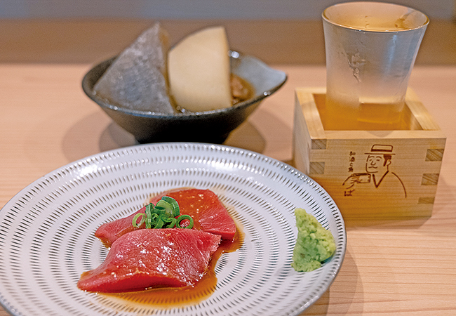 「お一人さまでも楽しめるように」と小皿で提供されるおつまみは約40種類。「本マグロ」(650円)の味付けには自家製の納豆しょうゆを、「おでん」(200円)にはしょうがみそを添えるなど、料理のあちこちに飲んべえ心をくすぐる仕掛けがちりばめられています。