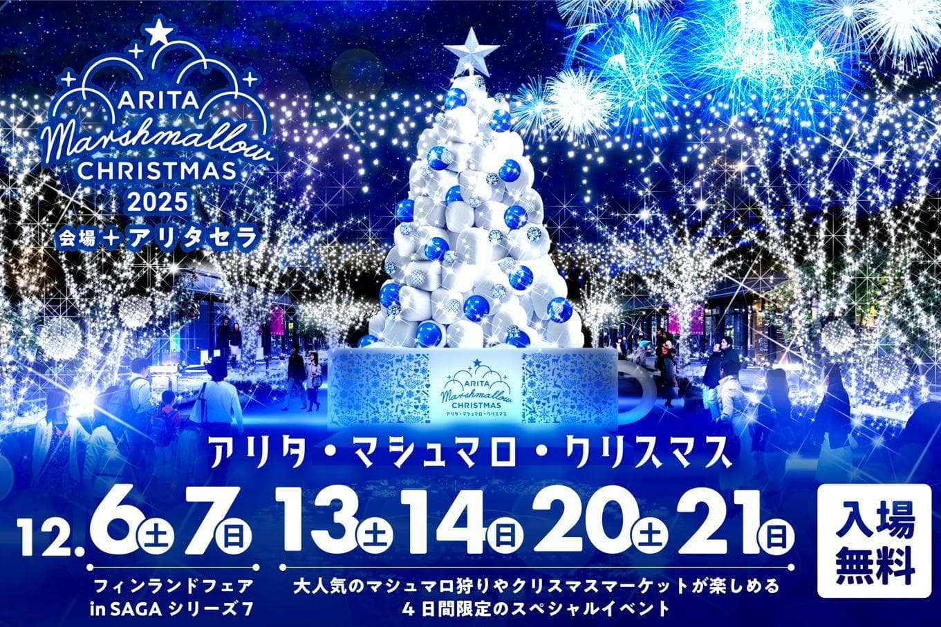 佐賀県有田町で毎年人気の冬イベント「アリタ・マシュマロ・クリスマス」が、2025年12月6日(土)からスタートします。有田焼の白と藍をテーマにした幻想的なイルミネーションや、焼きマシュマロ体験、クリスマスマーケットなど、心温まるコンテンツが盛りだくさん。福岡からも日帰りで楽しめる、有田ならではの特別なクリスマスを体験してみませんか?