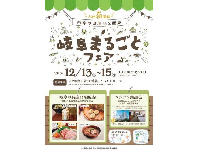 岐阜県の特産品が天神にやってくる!九州で初開催となる「岐阜まるごとフェア」が、天神地下街(福岡市中央区)で行われます。期間は 12月13日(土)~15日(月) の3日間。岐阜ならではの食品や工芸品などが並び、岐阜の魅力をたっぷり味わえます。
