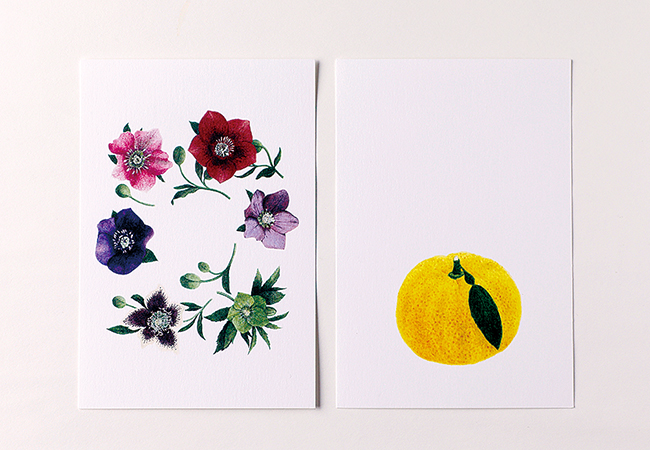 ボタニカルアート作家・三反栄治氏が描いた植物や動物の水彩画が約50種類並ぶ。同店のオリジナル商品で「ここでしか買えない」とまとめ買いする人も。