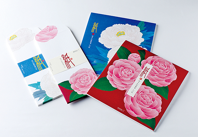 ピンクの乙女椿(つばき)や大輪の寒牡丹(ぼたん)など冬の花を大胆にデザイン。特有のはけ目がある「伊予和紙」は風合いがよく、「パール箔(はく)」や「パールシルク印刷」をのせた花びらはキラキラ♡ 手紙を開けた時の華やかさにうっとりする30~40代の女性が多いとか。お札やギフト券が入るサイズ。