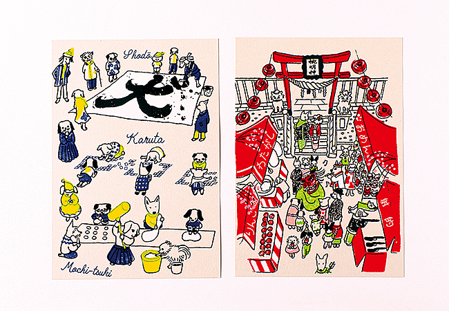 風合いのある色紙にシルクスクリーン版画で、一枚一枚手刷りで印刷。約40種類ある中、新年のシーンを描いたものや福岡限定シリーズも人気。