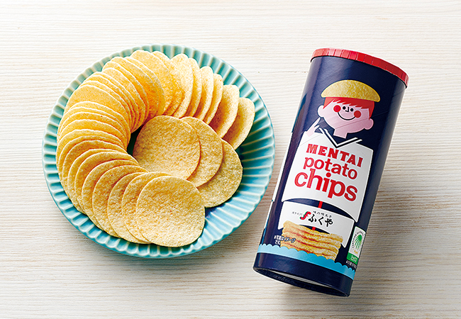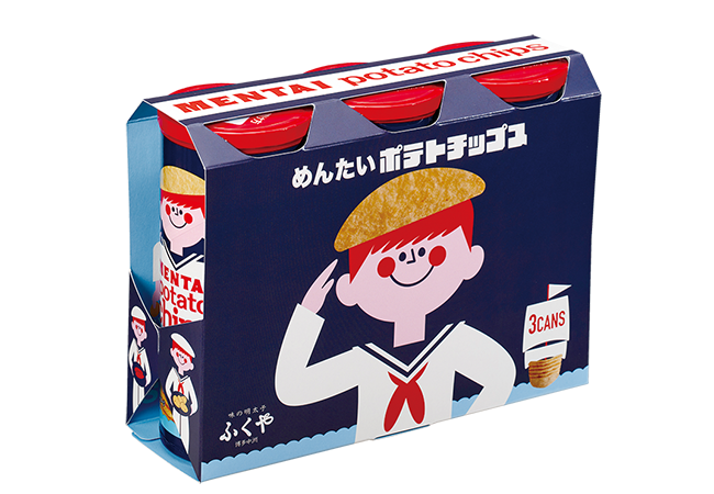 パリッと軽い食感と、ピリッとした辛みがマッチした明太子(めんたいこ)味のポテトチップス。「ふくや」の明太子を漬け込んだ後の調味液を粉末状にしたパウダーを使用し、ぎゅっと凝縮された唐辛子の辛みとたらこのうまみを味わえます。パッケージと3本セットのスリーブには、「海の幸」である明太子から着想を得た水兵さんのイラストが。