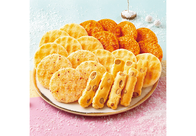 国産米と福岡県直方・福智山山系の地下水を使用。製造過程にもこだわって作られた老舗「もち吉」の人気商品が楽しめる冬季限定の詰合せです。内容は、せんべい「餅のおまつり」3種類(サラダ味、しょうゆ味、うめざらめ味)と、風味豊かなおかき「ふくよか餅(チーズ味)」の合計26枚入り。温かみのあるデザインの包装紙で届けます。