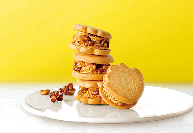 12月で創業120周年を迎える「石村萬盛堂」の人気商品。「博多手一本」をモチーフにしたお菓子で、名前の由来も“祝(いお)うて三度”の掛け声から。厳選したバターを使ったかわいい手形のクッキーに挟むのは、ほろ苦いキャラメルクリームと、キャラメリゼしたカリカリのクルミ。濃厚なのに後味はさっぱりと食べやすいキャラメルサンドです。