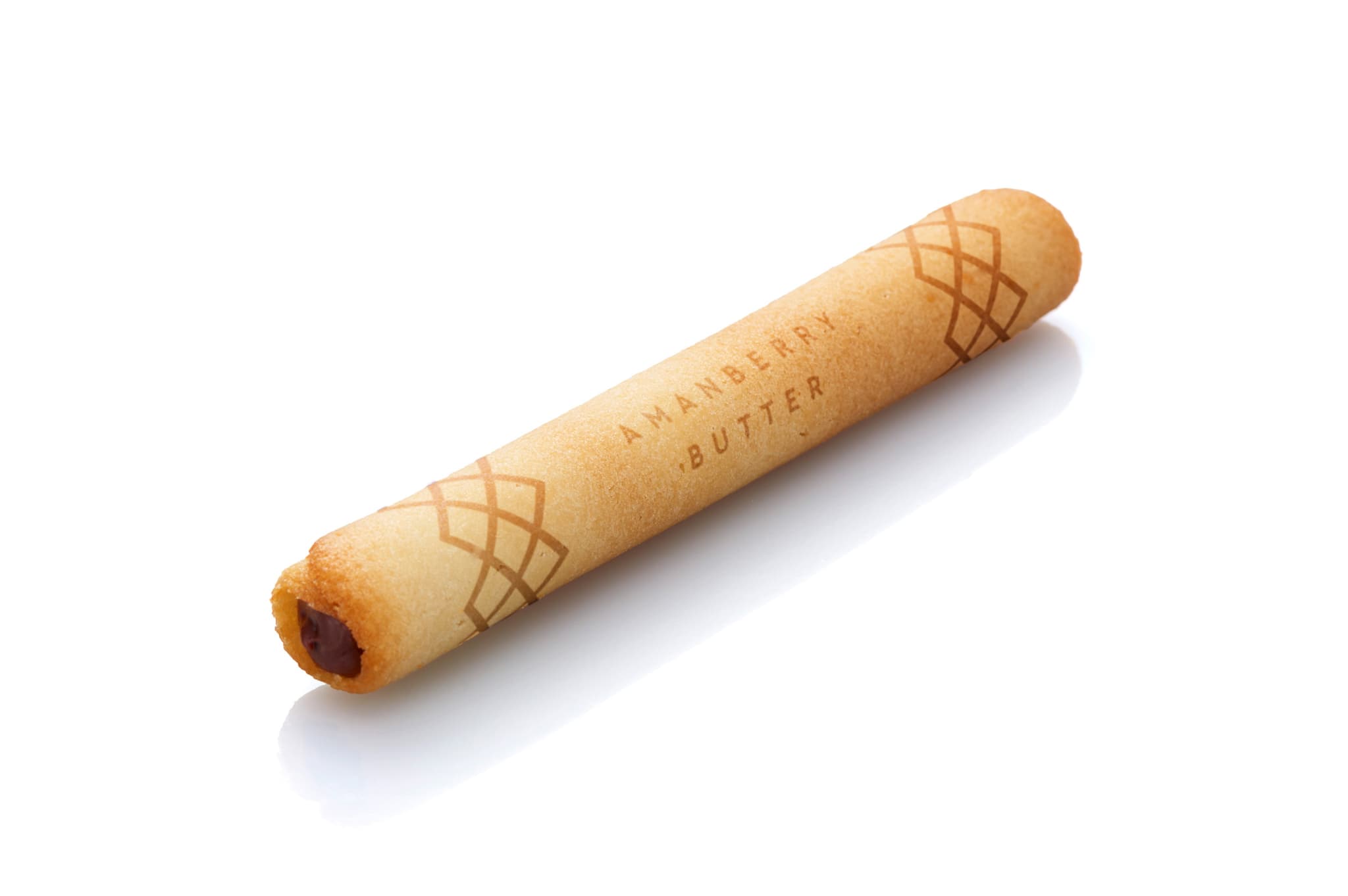 「アマンベリーバター」は、福岡が誇るいちご「あまおう」を使ったチョコレートを、サクサク食感のラングドシャで包み込んだロール菓子。あまおうの爽やかな香りと濃厚な甘み、そしてバターの豊かな風味が絶妙に調和し、口に入れた瞬間に広がる贅沢な味わいが特徴です。