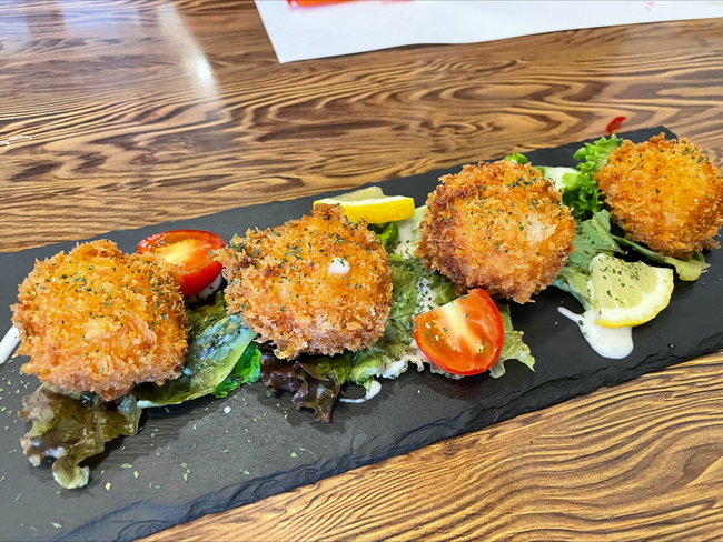 揚げたてアツアツの「手造りずわい蟹のくりぃむコロッケ」。蟹の身がたくさん入っていて、別で注文していた、カニ味噌にディップしても最高でした。