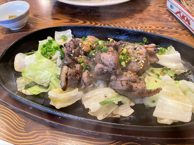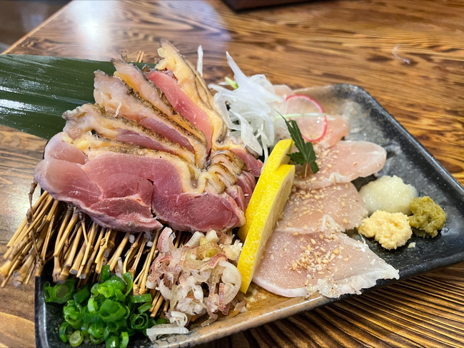 そしてもう一つの名物「赤どり炭火タタキ」。こちらはモモとムネの2種類となっており、それぞれ違った食感を楽しみことができました。食べる前はモモ派だな~と思っていたのですが、実際食べてみるとムネもおいしい…と自分の新たな食の好みがひらかれた気がします笑