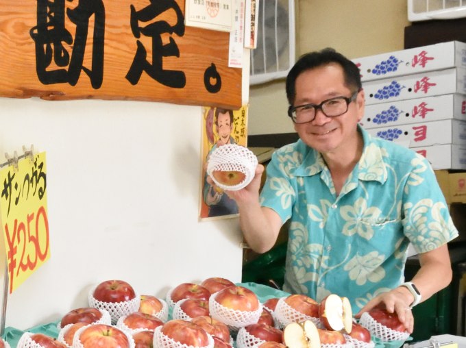 店内には、青果市場の競り人として培った井関さんの“目利き”が光る旬のフルーツや野菜も並びます。夏季限定で登場する、フルーツ山盛りのふわふわ系かき氷も人気です。