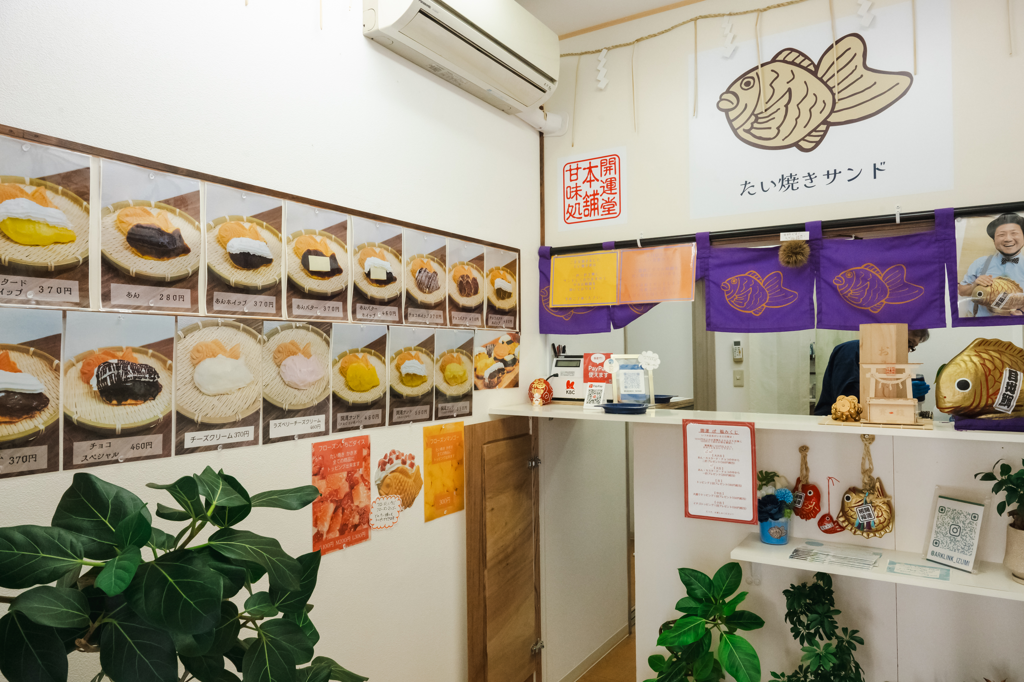 同店はテイクアウト専門店で、気軽に立ち寄りやすい雰囲気。神社の御神事に携わっているというオーナーの山形政則さんが名付けた店名にちなんだ開運グッズも見られます。たい焼きサンドの種類は全部で25種類あり、280〜600円とどれもお手頃価格です。