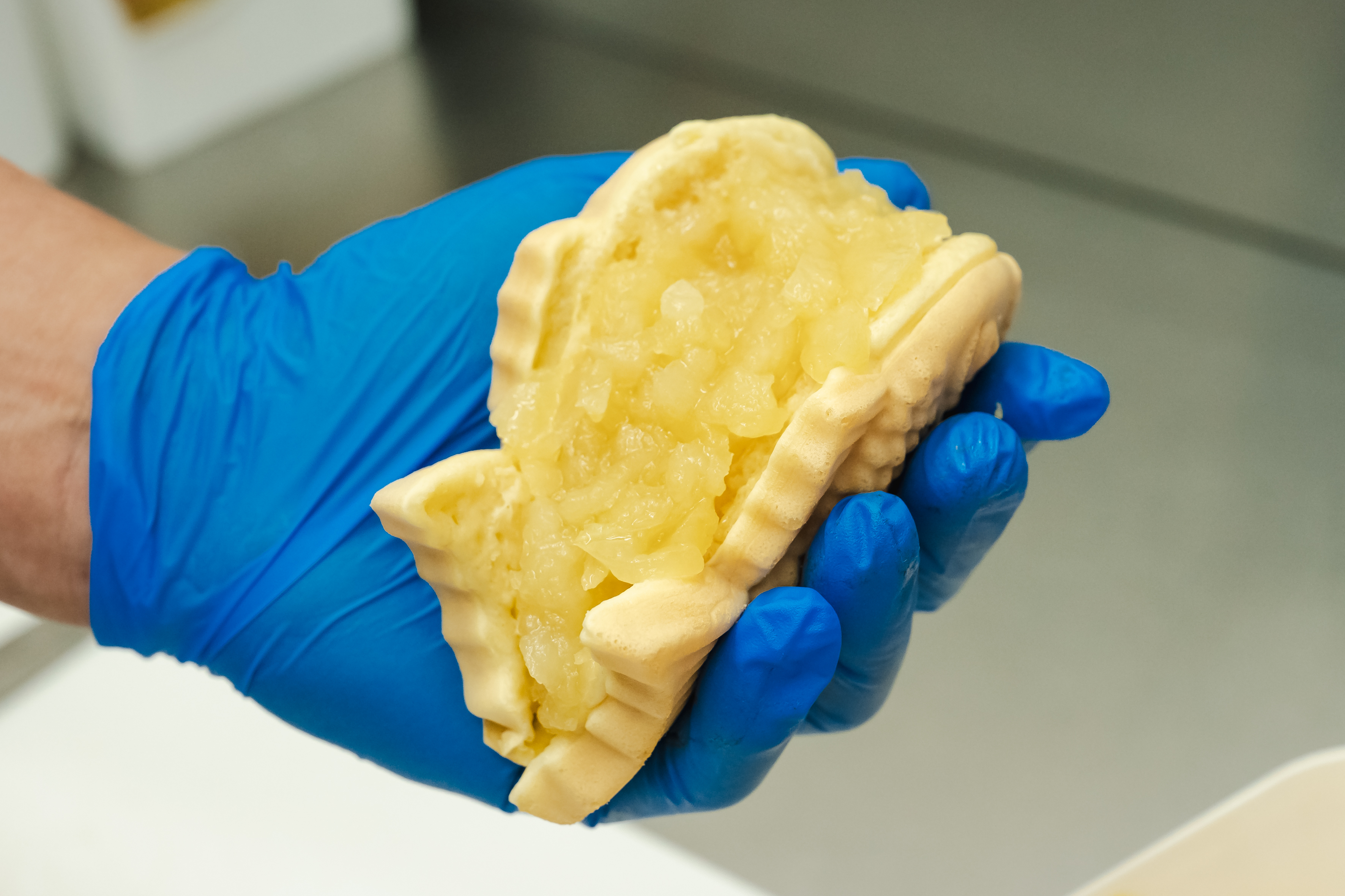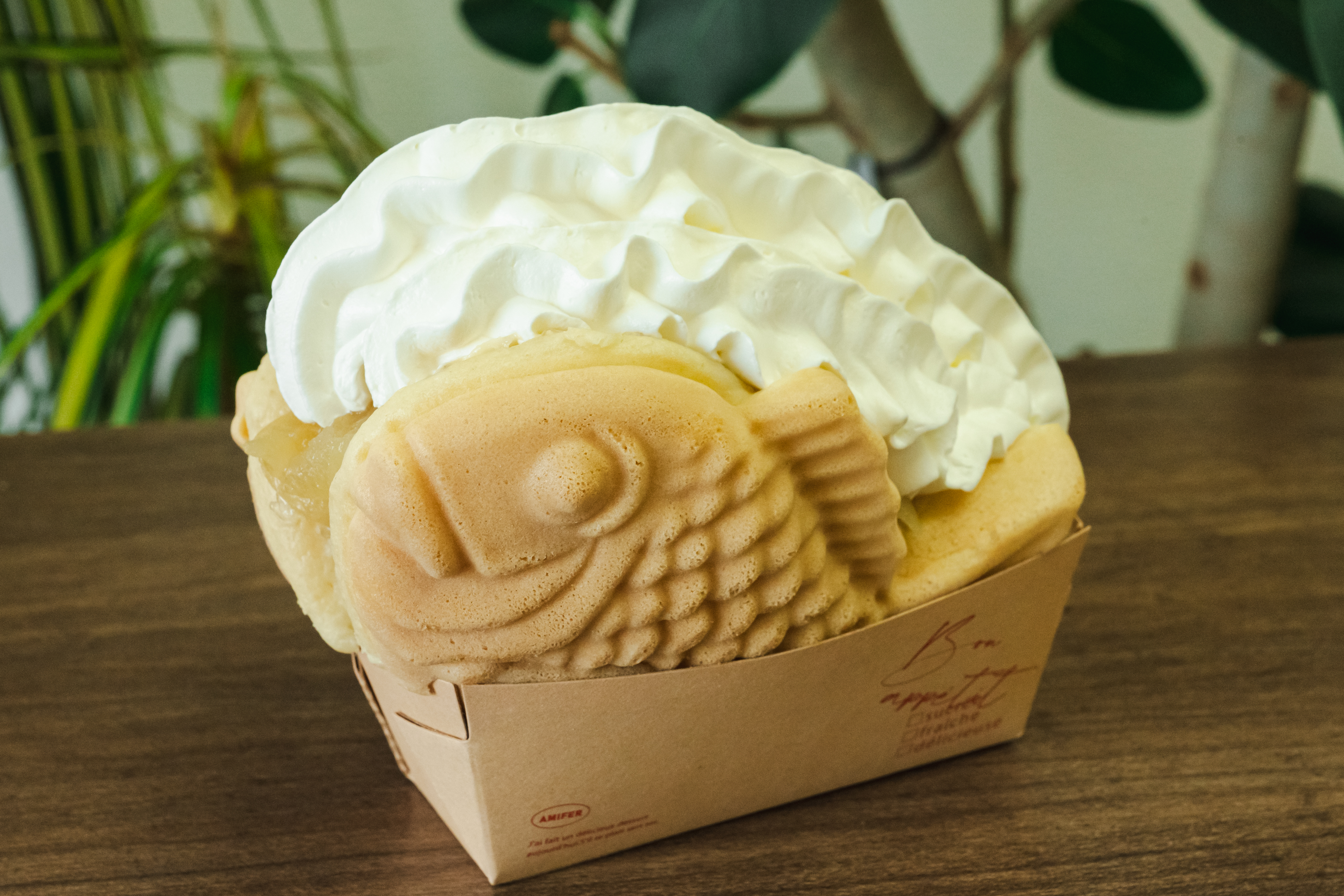 同店のたい焼きサンドは、生地を分けて焼いてバターシロップを塗り、注文後に具材をサンドする珍しいスタイル。毎朝焼き上げるという生地は、しっとりふわふわで一般的なたい焼きとは食感が異なります。