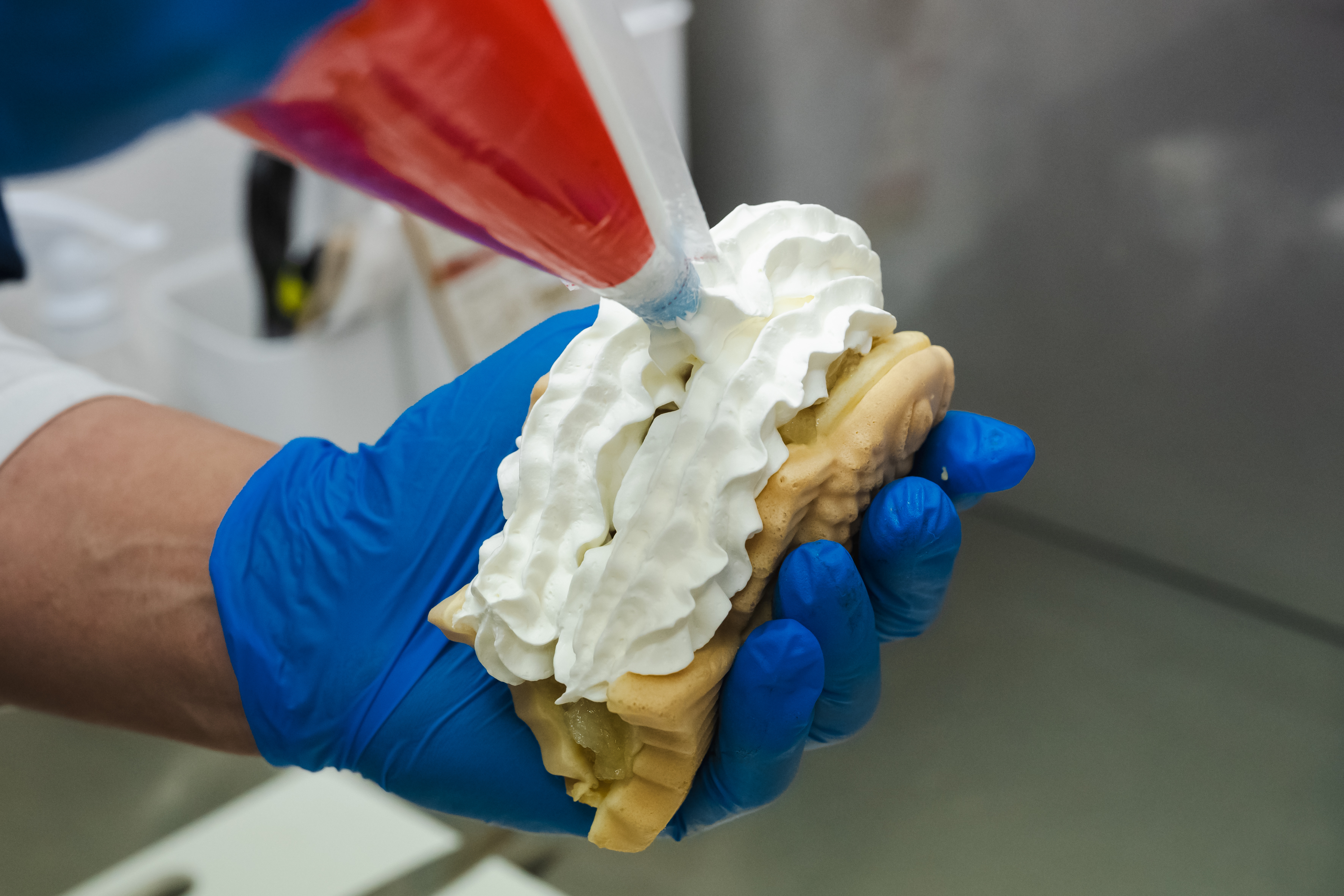 「開運サンド」単体でもおいしいですが、ホイップクリームをたっぷりのせた「開運サンドホイップのせ」(580円)は特に人気。リンゴのコンポートを挟んだ後に、ホイップクリームが1ライン、2ライン、3ライン! たっぷり盛られていきます。