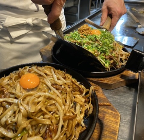 「きつね」の焼うどんは、特製の平打ちパリパリ麺と、甘みとコクを兼ね備えた秘伝ソースが最大の特徴。鉄板で一気に焼き上げることで、具材の旨みを閉じ込め、香ばしさと食感のコントラストを生み出します。