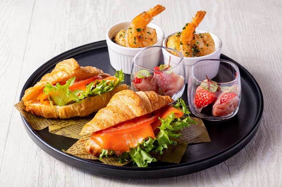 セイボリーは、サーモンとアボカドのクロワッサンサンド、アンチョビガーリック香るシュリンプ&ポテト、生ハムといちごの組み合わせなど、甘味と塩味の絶妙なバランスが魅力です。