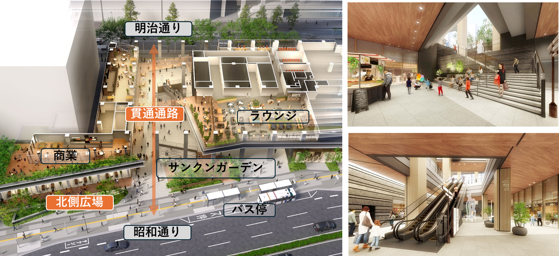 地上バス停とも近接する交通結節点となるこの場所に、各種イベントも開催可能な「広場空間」が整備予定です。明治通りと昭和通りに大きく面した配置となり、バス停付近には来街者が憩える「地上広場」も計画されているとのことです。