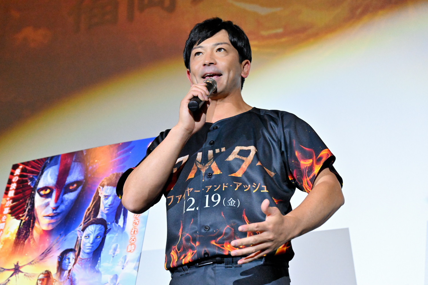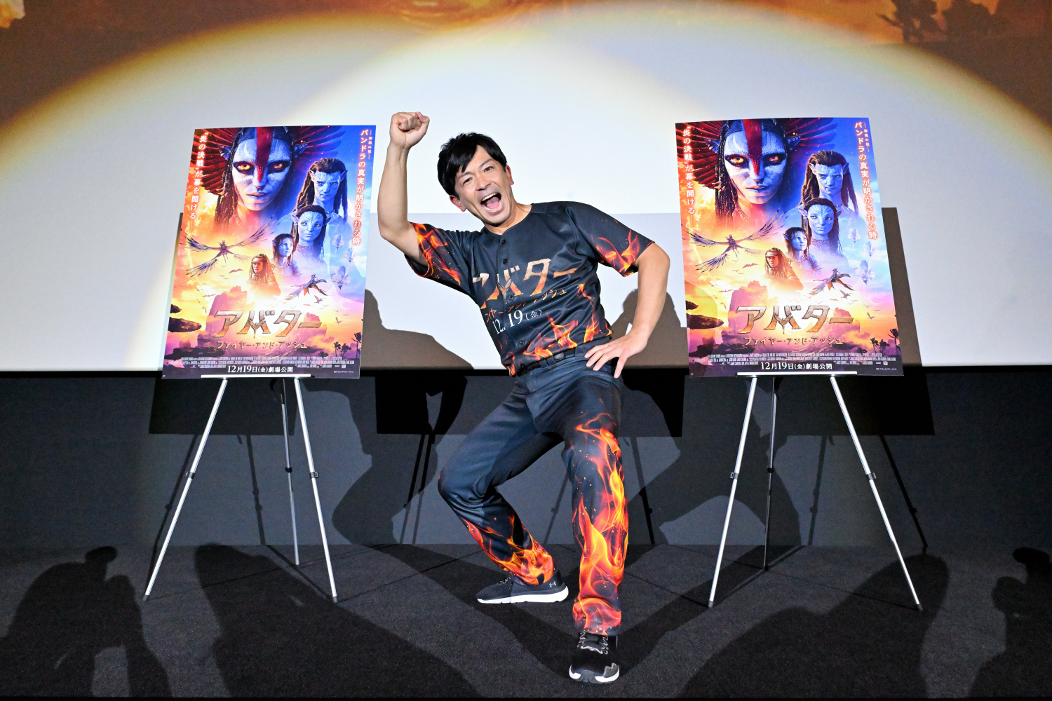 映画『アバター:ファイヤー・アンド・アッシュ』の公開に先駆け、T・ジョイ博多にて福岡プレミア試写会が開催されました。ゲストには、本作のテーマである「炎」をイメージした特注ユニフォーム姿の松田宣浩さんが登壇。客席通路からのハイタッチ入場に、会場は即座に熱狂の渦に包まれました。