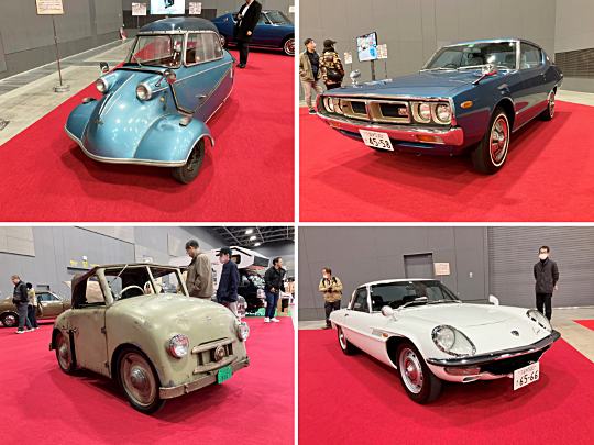 昭和36年式 メッサーシュミット(ドイツ車)、昭和49年式 日産 スカイライン2000GTX KGC 110型「ケンメリ」、昭和26年式 オートサンダル FS型プロトタイプ、昭和47年式 マツダ コスモスポーツ後期型