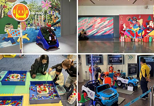 左上より時計回りに、TOYOTA Kids mobi、アーティスト・dollyさんのライブペイントとフォトスポット、JAF福岡のブース、トミカ釣り