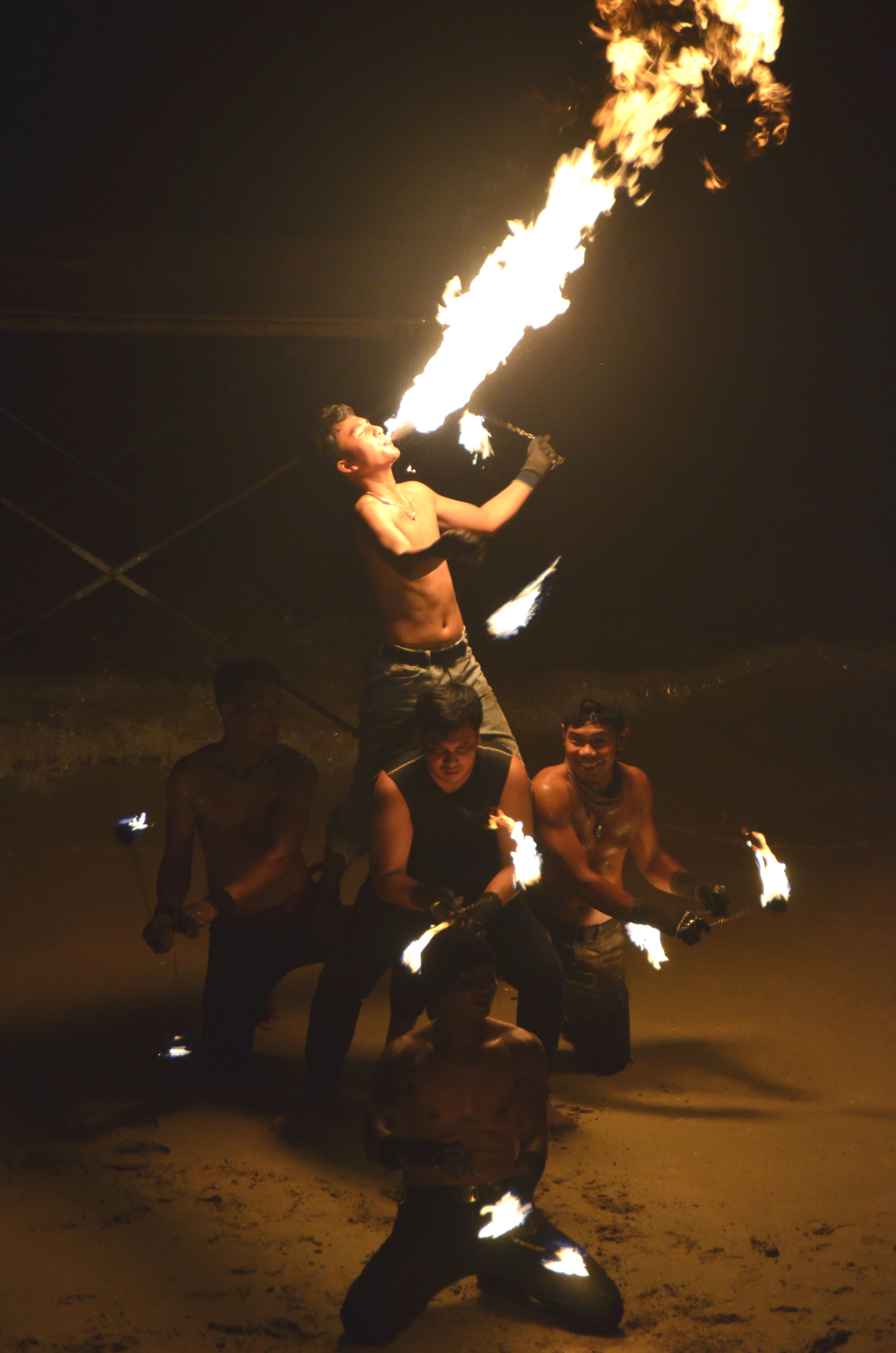 ショー自体がかなりスリリングで、口から火を吹く場面あり、多量の細かな火の粉をまき散らす場面もありました。レストラン利用者であれば誰でも無料で楽しむことができ、男たちがテーブルの近くに寄ってきて、間近で〝技〟を披露してくれます。近くで見ると、炎の熱が感じられます。