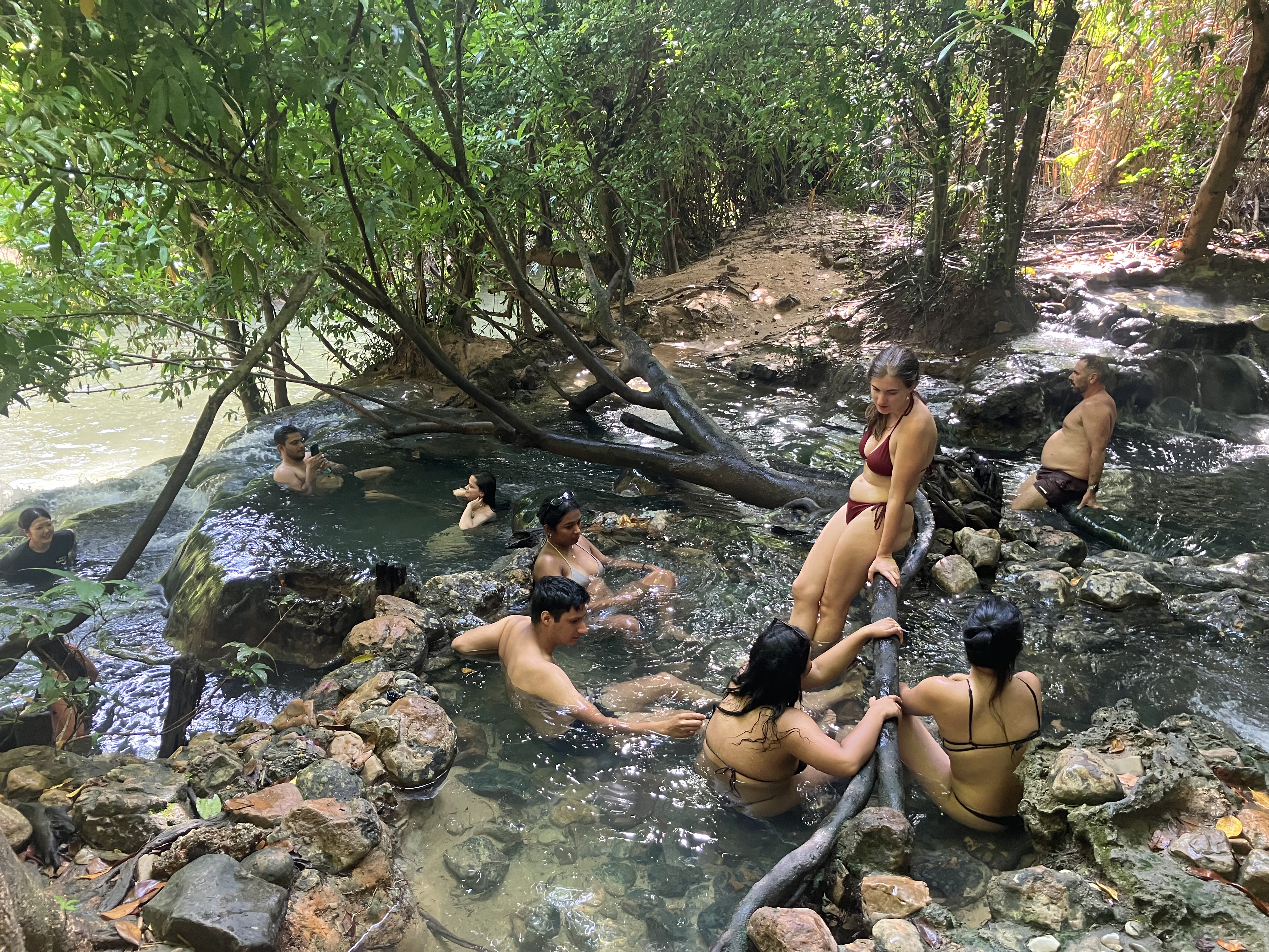 クロントム温泉は上流から湧き出す温泉が、ちょうど川の本流に注ぐ手前のため適温になっているようです。張り巡らされた木々の根や、固まった温泉成分が棚田のような景観を形作り、川に注いでいます。ところによって天然の浴槽のようになっているところも。川に飛び込んで「水風呂」代わりにする人もいました。