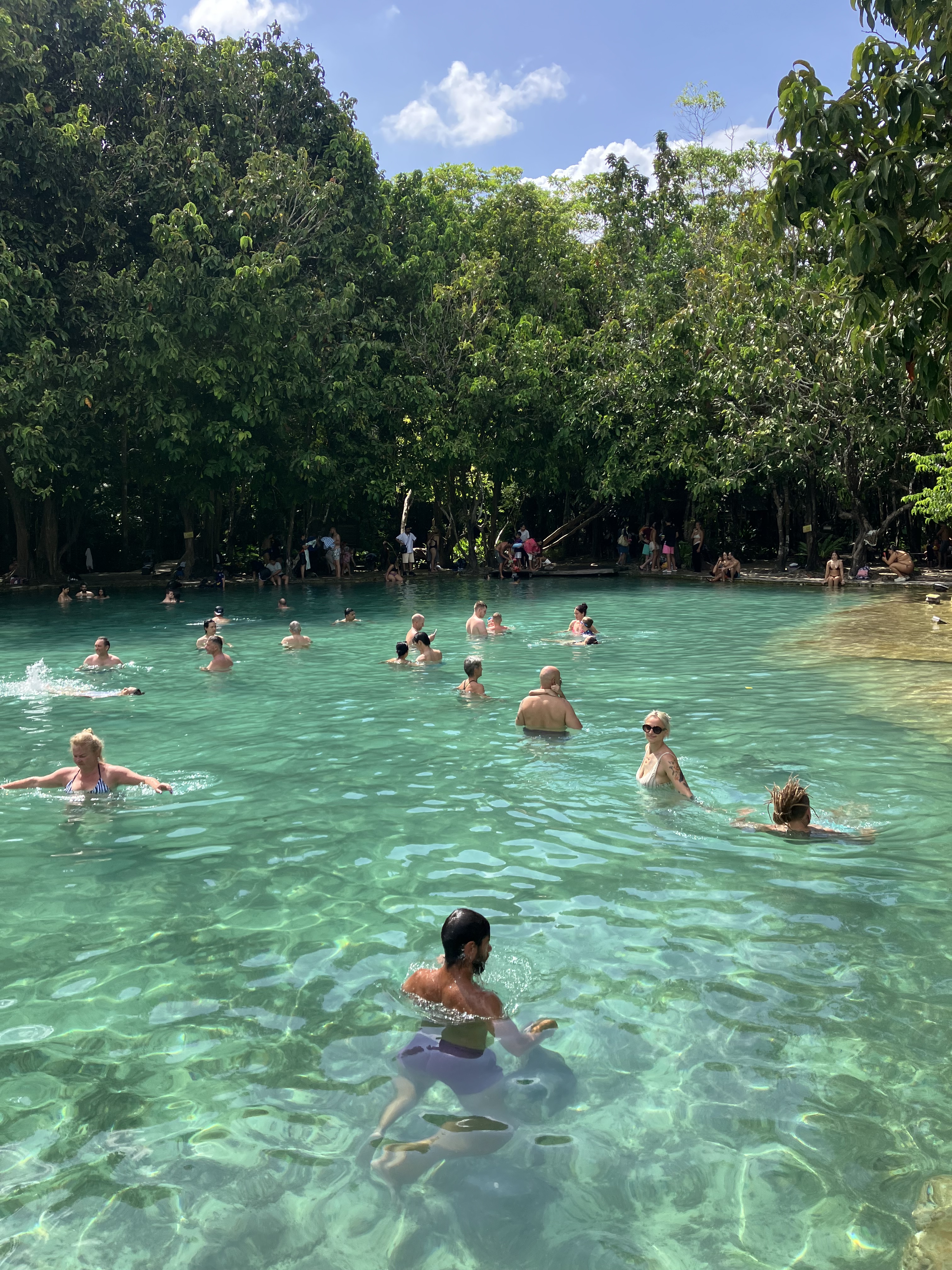 これだけでは終わりません。さらに熱帯雨林を20分ほど奥へ進むと、エメラルドプールの源泉といわれる二つ目の目的地「ブループール」に到達します。ここの魅力は、何といっても息をのむ水の青さ。水の中には多くの倒木もあり、やや不気味な印象もありますが、自然がつくりだした美に圧倒されました。ここは泳ぐことはできません。温度は30~50度あるそうです。