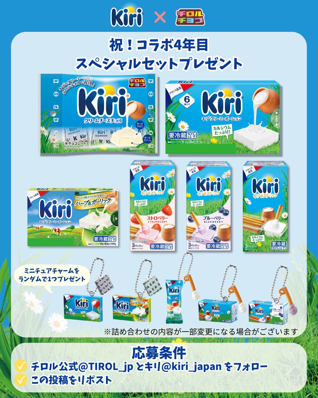 応募方法:チロルチョコ公式(@tirolchoco_official)とキリ(@kiri_jp)のアカウントをフォローし、キャンペーン投稿にコメント